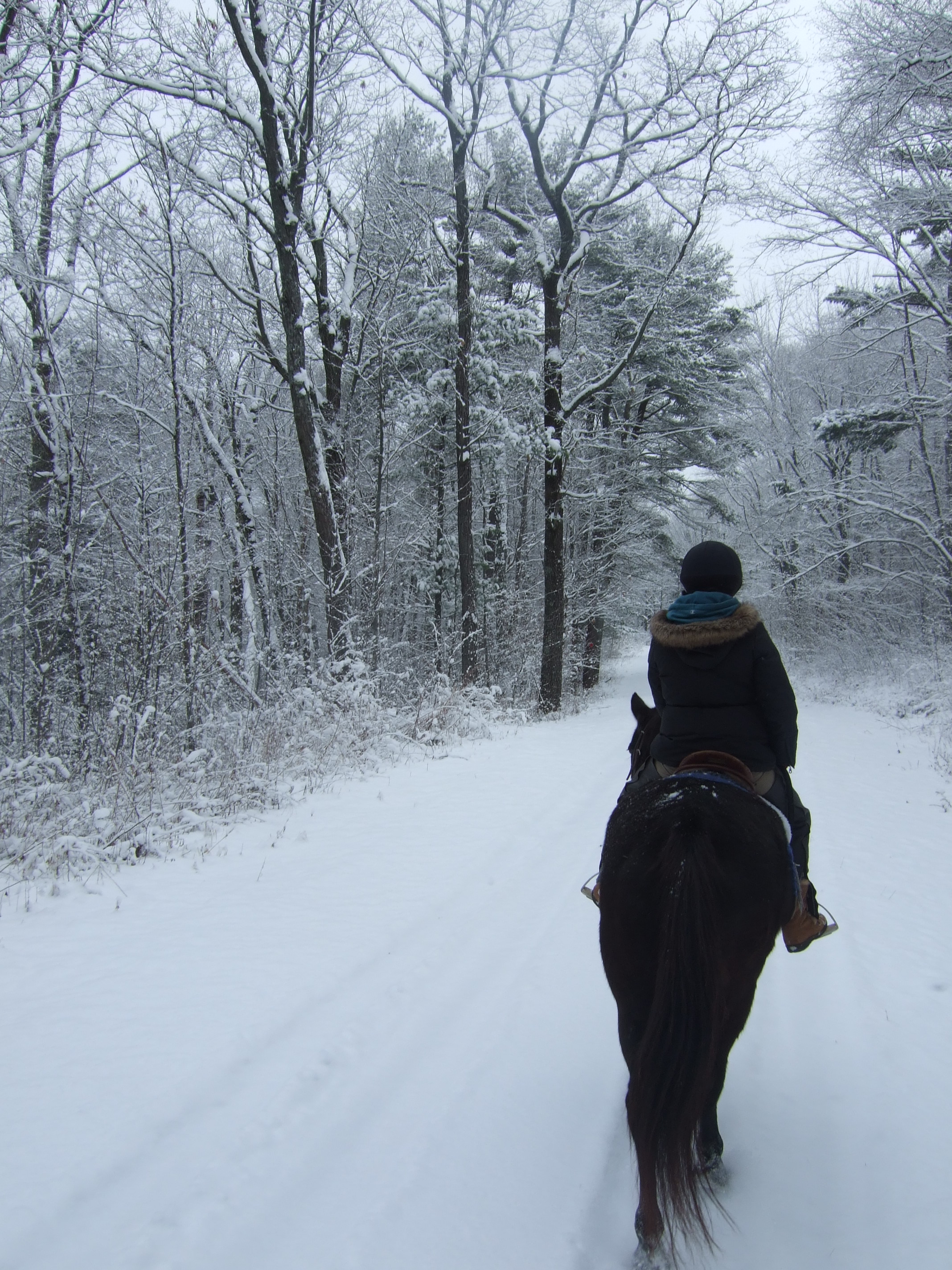 The winter season brought a tremendous amount of snow. The three of us rode on the main road which cuts through the park, and stayed off the trails. The road wasn’t plowed; however, the hard packed roadbed gave an even surface and good traction for the horse’s hooves. The freshly fallen snow provided a delightful and thrilling experience when the horses broke into a trot or canter.