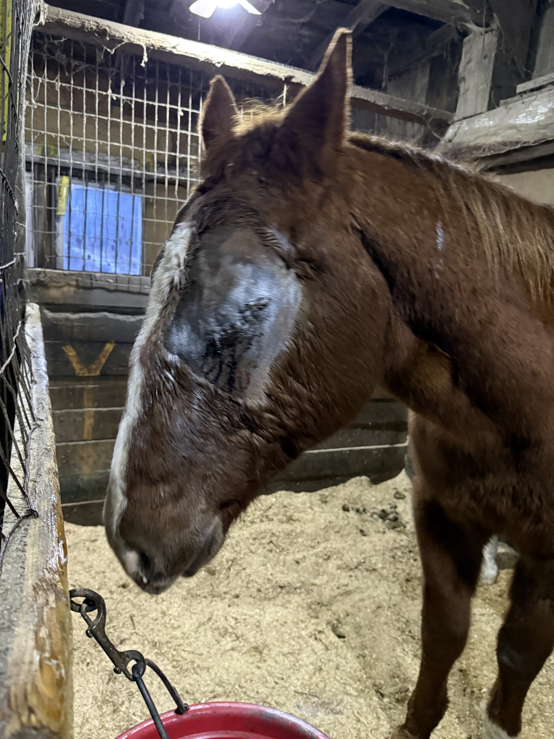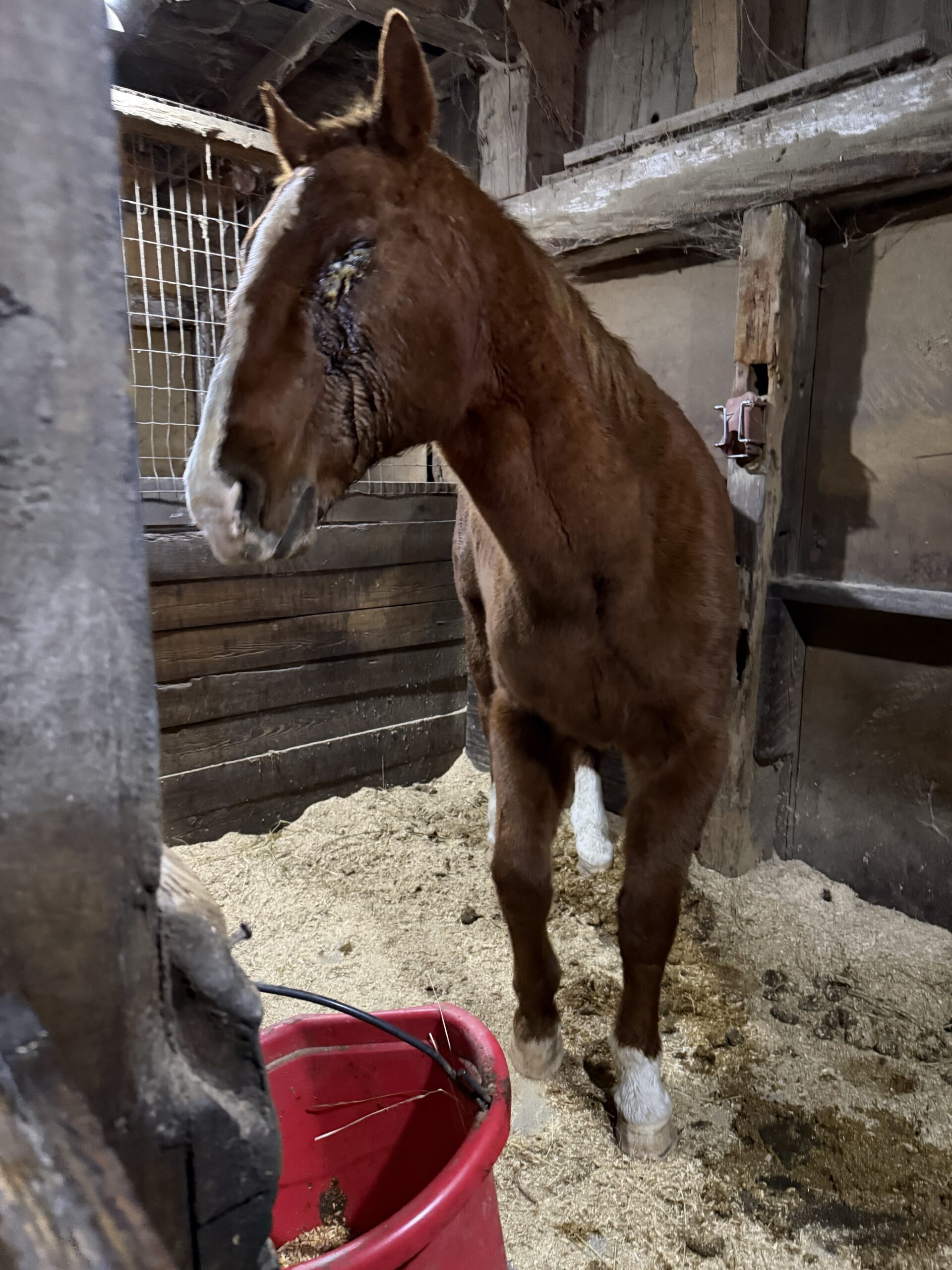 A few days ago, Connie came to the barn, fed the horses, and noticed that Jupiter’s eye was watery with pus. She put an ointment on his eye to fight the infection. Unfortunately, in the following days, he got worse with greater pus flowing from his eye, which now wouldn’t open. So, Connie called the vet, scheduled an appointment and waited for her to come to the barn.