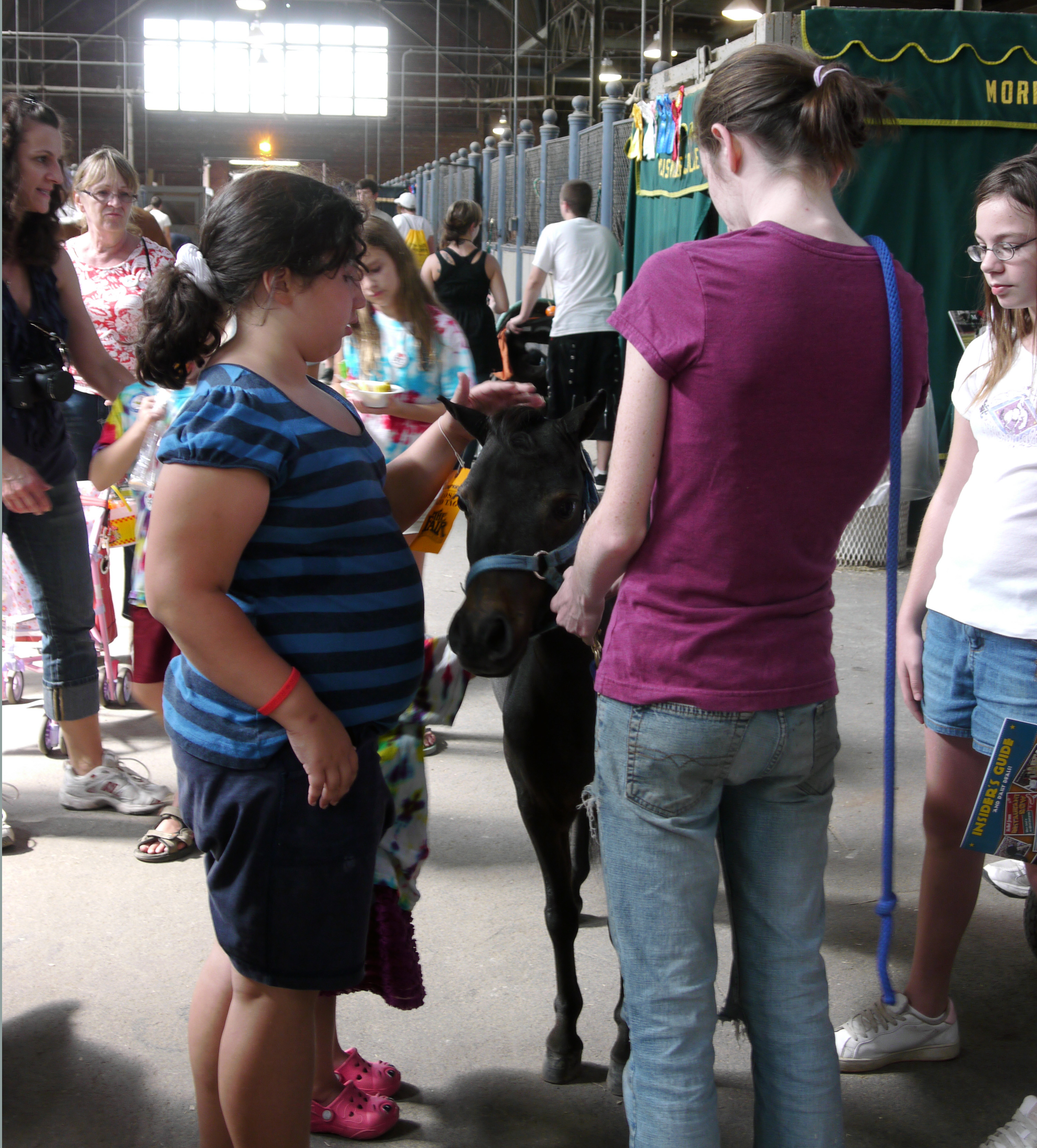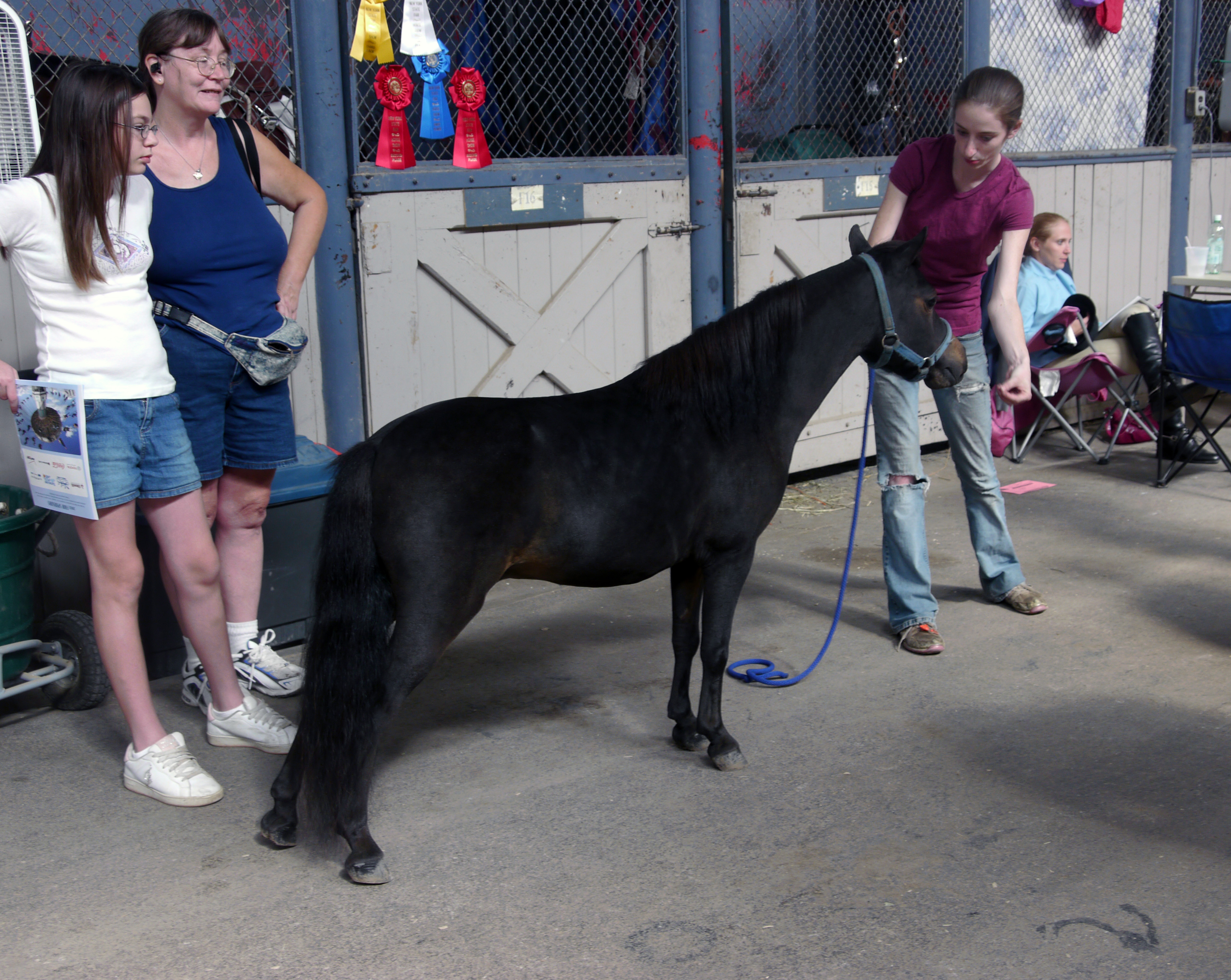 We said good-by and good luck to Jill and walked down the wide aisle between stalls. A bit further we met another young woman who was surrounded by admirers. People towered over the small horse. I remembered seeing her drive a cart pulled by a tiny, black horse in the Coliseum arena a short time before we came into the stables. The horse was very well-mannered and not bothered by the crowd.