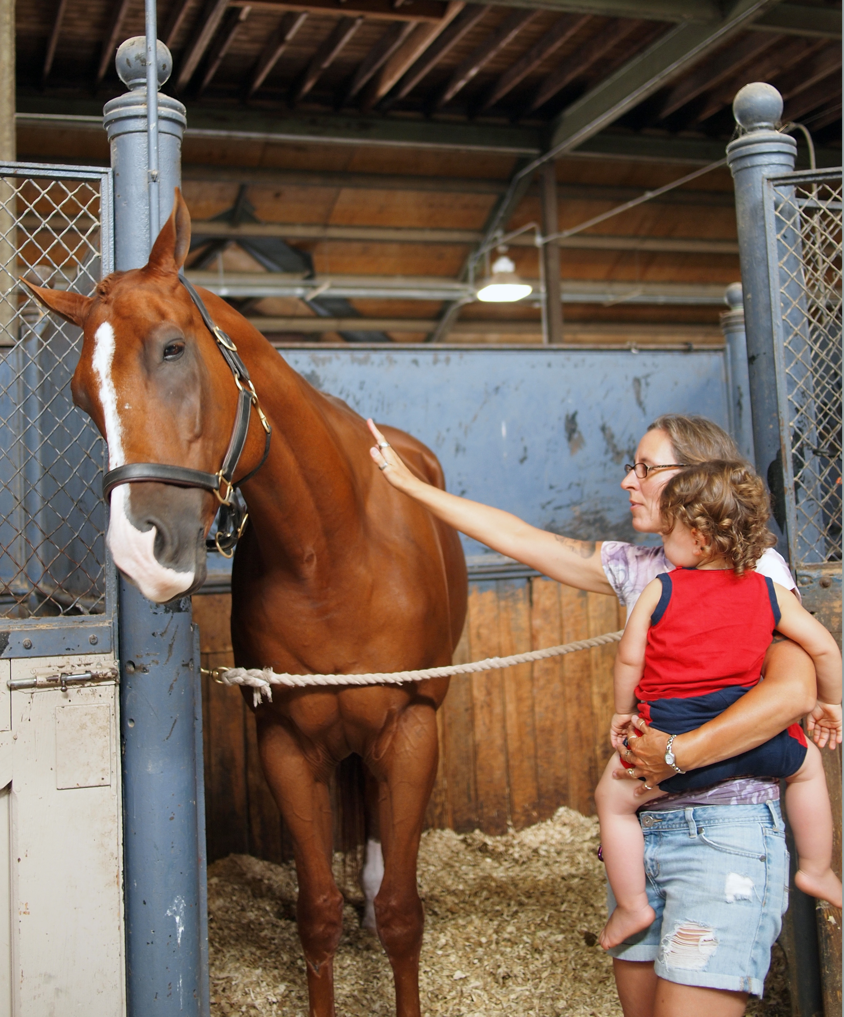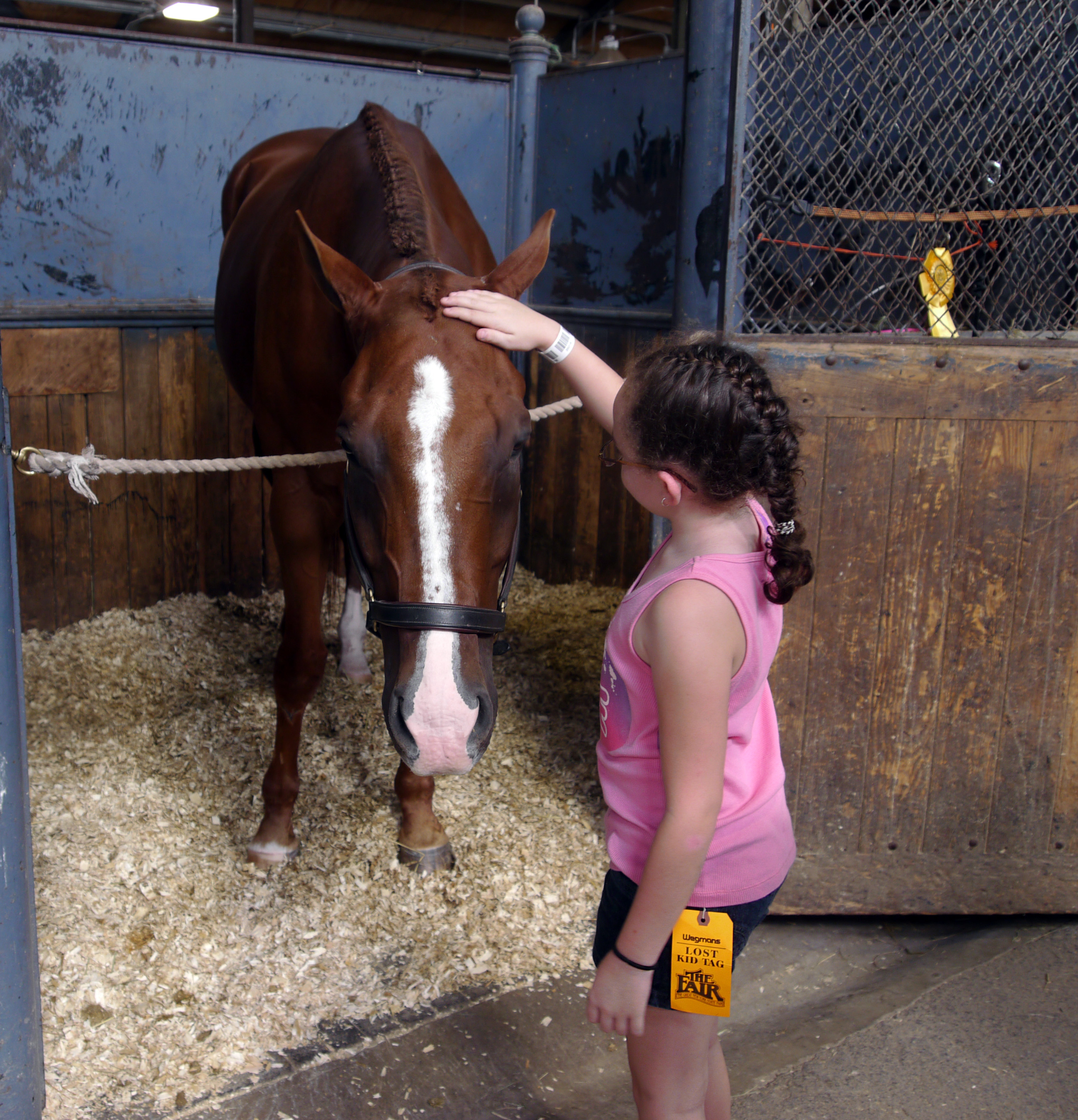 We finished eating and stepped inside the Country Max Horse Barns where crowds of people gathered to look at the horses in their stalls. One woman had her stall gate open with a rope across the front to keep her horse in. Lots of children and adults gathered around petting the gentle horse. I stopped to take pictures and spoke with the horse’s owner, Jill Buday from Sullivan County.