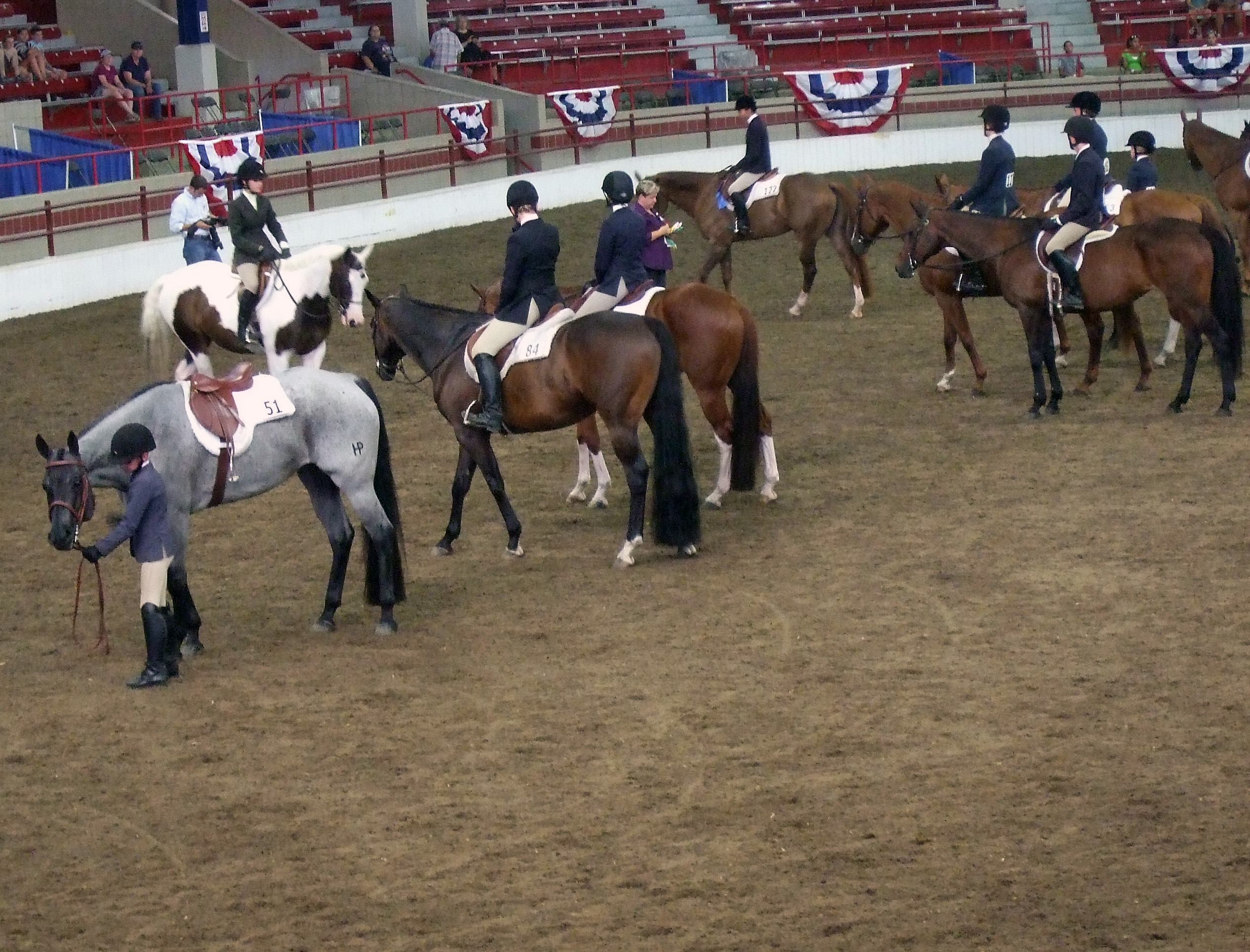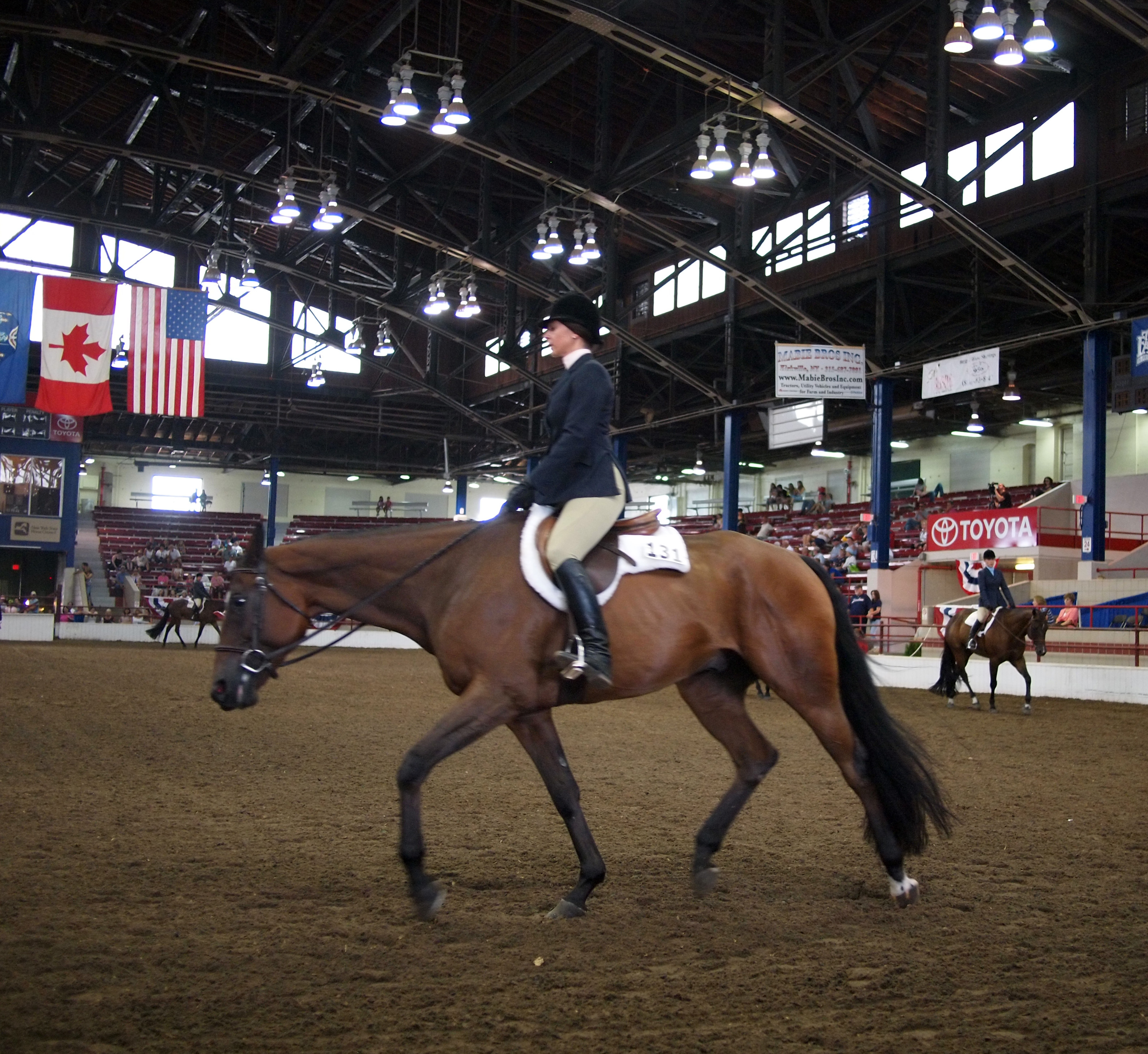 We found Moe and the three of us walked through the crowds in Restaurant Row and the Marketplace Pavilion drifting into the Poultry Barn where we saw soft, fluffy Silkies died pink, blue and yellow. There were rows and rows of cages containing chickens, turkeys, geese, and ducks. We meandered out of the Poultry barn and strolled into the Goat, Llama & Swine Barn, finally emerging from the opposite end of the building into open sky and sunlight. After that there was only one place to go; back to the horse show where we watched the amateur hunters jump, the pleasure horses running walk, the Arabs prance and draft ponys pull a huge wagon. We witnessed only one misshape when a young woman fell from her horse and walked out of the arena unhurt.