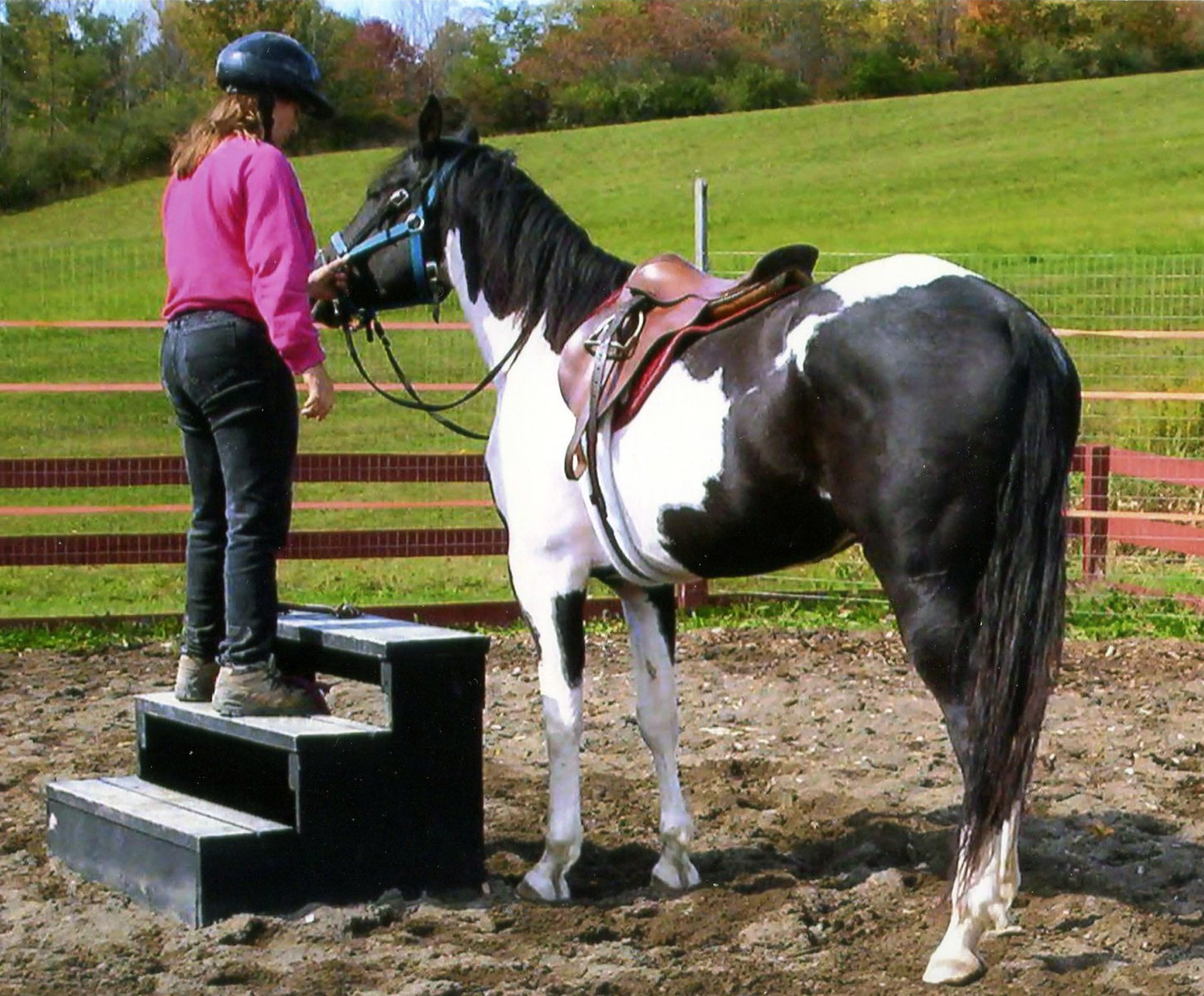 In the meantime, Connie hired Anne Shafer to break CJ and Johnn built a round pen. Anne came once or twice a week to work with CJ. The horse became distracted when Connie stood outside the round pen watching so she hid herself behind bushes, snapped pictures and enjoyed watching Anne teach CJ. Anne put a halter on the gelding and rode him bareback. Then she moved to the English saddle letting the horse learn simple commands and feel the weight of a rider. Things went well, and CJ, a quick learner progressed through his lessons. Finally, the time came to put on the Western saddle. Anne stood next to the little painted horse, when suddenly he spooked catching the saddle horn in the wire mesh of the round pen. CJ panicked, ripped off the horn, freeing himself from the fence as the saddle slumped to his side. He calmed down and stood quietly for Anne to fix the saddle and resume the lesson.