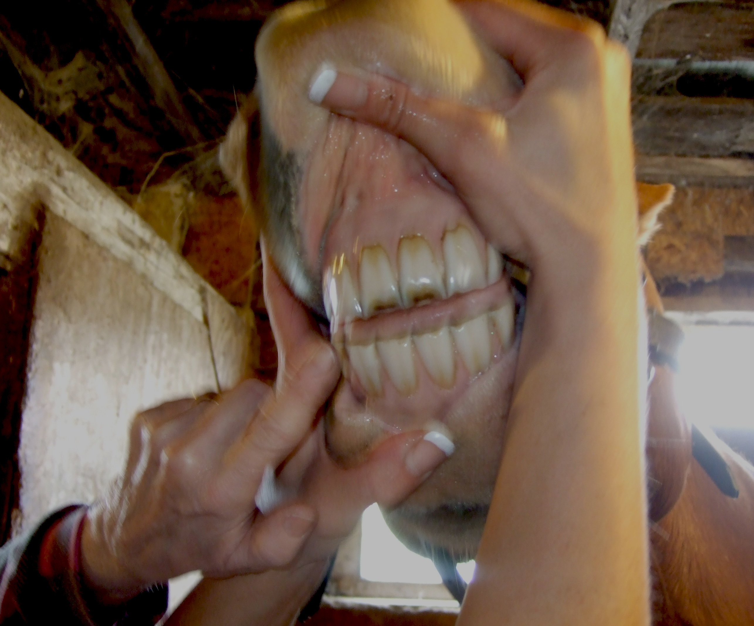 In their stalls, the horses waited to have their teeth floated. Brianne greeted us and started to work. Skillfully, she fitted a strange, heavy metal instrument, much like a bit, into Socks’ mouth. Socks’ incisors rested upon the speculum’s metal plates and a leather strap went around his nose. The speculum prevents the horse from closing his mouth, so the equine dentist can work on the teeth. As she worked, Brianne spoke about horses, bad hay, travels, experiences as an equine dentist, and her profession and training; all of which helped relax the horse.