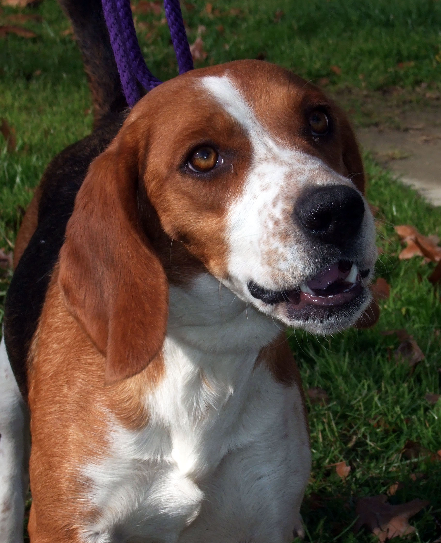 Anne and I left the office and entered the area that housed the indoor dogs. The enclosure contained three rows of cages filled with dogs. As soon as we walked into the enclosure, all the animals started barking for attention. Each dog had a plastic covered information tag clipped to the wire gate of their pen. Anne stopped in front of a cage housing a small beagle.