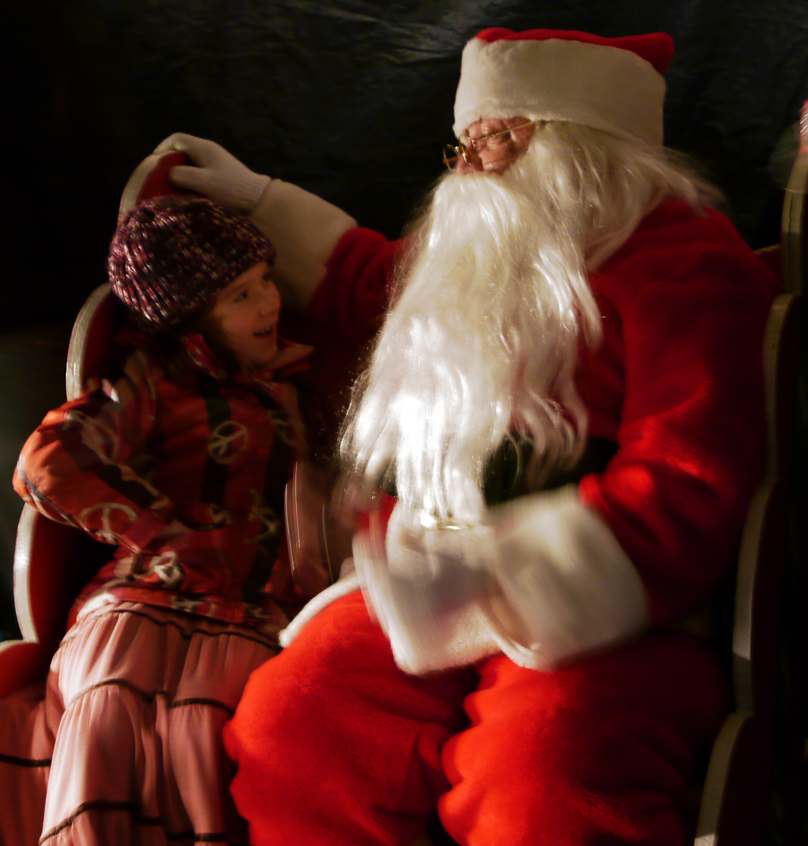 When we reached the festival the hum of conversation, Christmas music and lights filled the park; people were everywhere. Tea candles flickered inside paper lunch bags which lined the sidewalks bordering the square. Several burn barrels, red and orange flames licking at the chilly night air, served as a gathering place where people enjoyed the heat and chatted. Lengthy tables decked out with a wide array of delicious, prepared foods stood near the bandstand. Three ice carvers, spaced some distance apart, worked with chainsaws, chisels and die grinders. A spray of tiny water particles formed a frozen mist silhouetting the carvers as they turned ice blocks into sculptures. Meanwhile, families created a line stretching across the lawn as they waited their turn to ride in a horse drawn wagon. Not far away, the Lion’s Club awning sheltered Santa in his sleigh ready to hear holiday wishes from youngsters waiting in another long line.