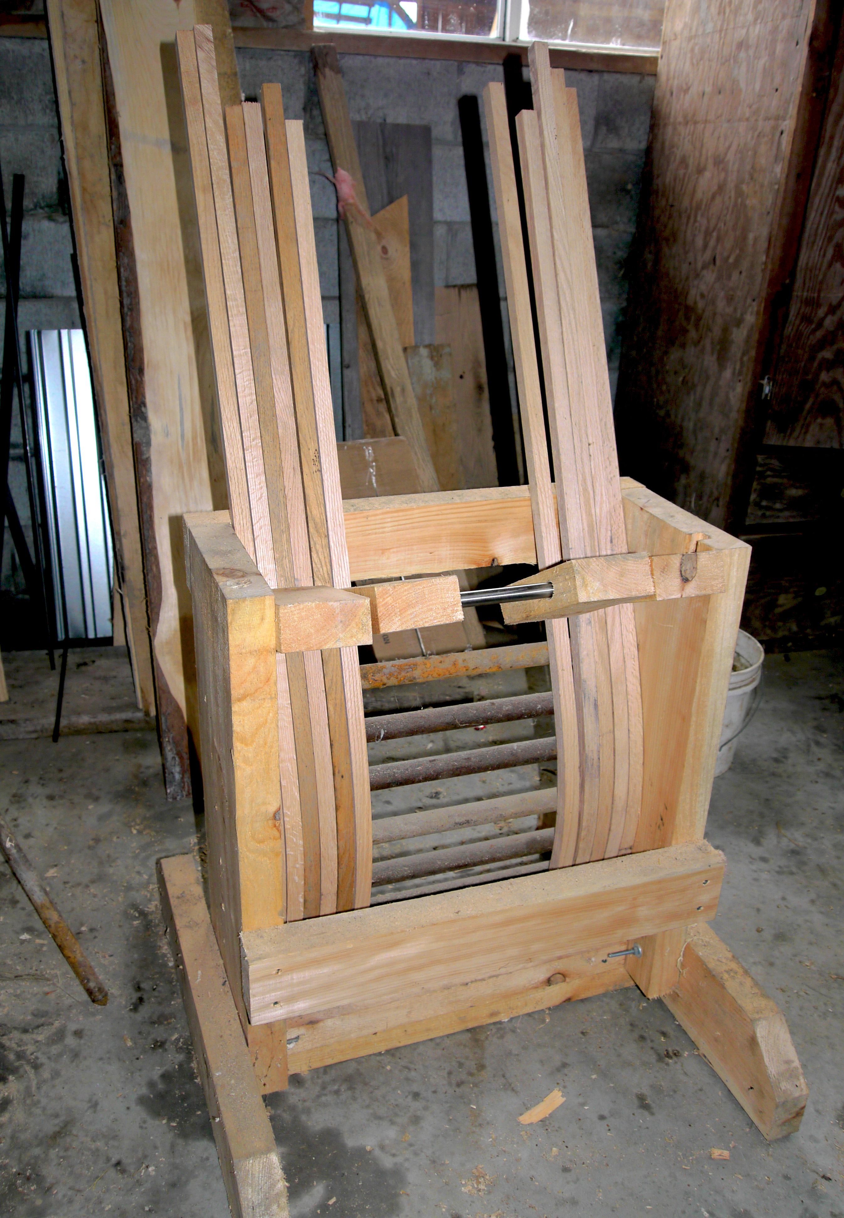 “This is how the sides of the doors are made,” said John walking over to a large wood vise. The claps held identical strips of wood about 1 inch in diameter and bent at the ends.