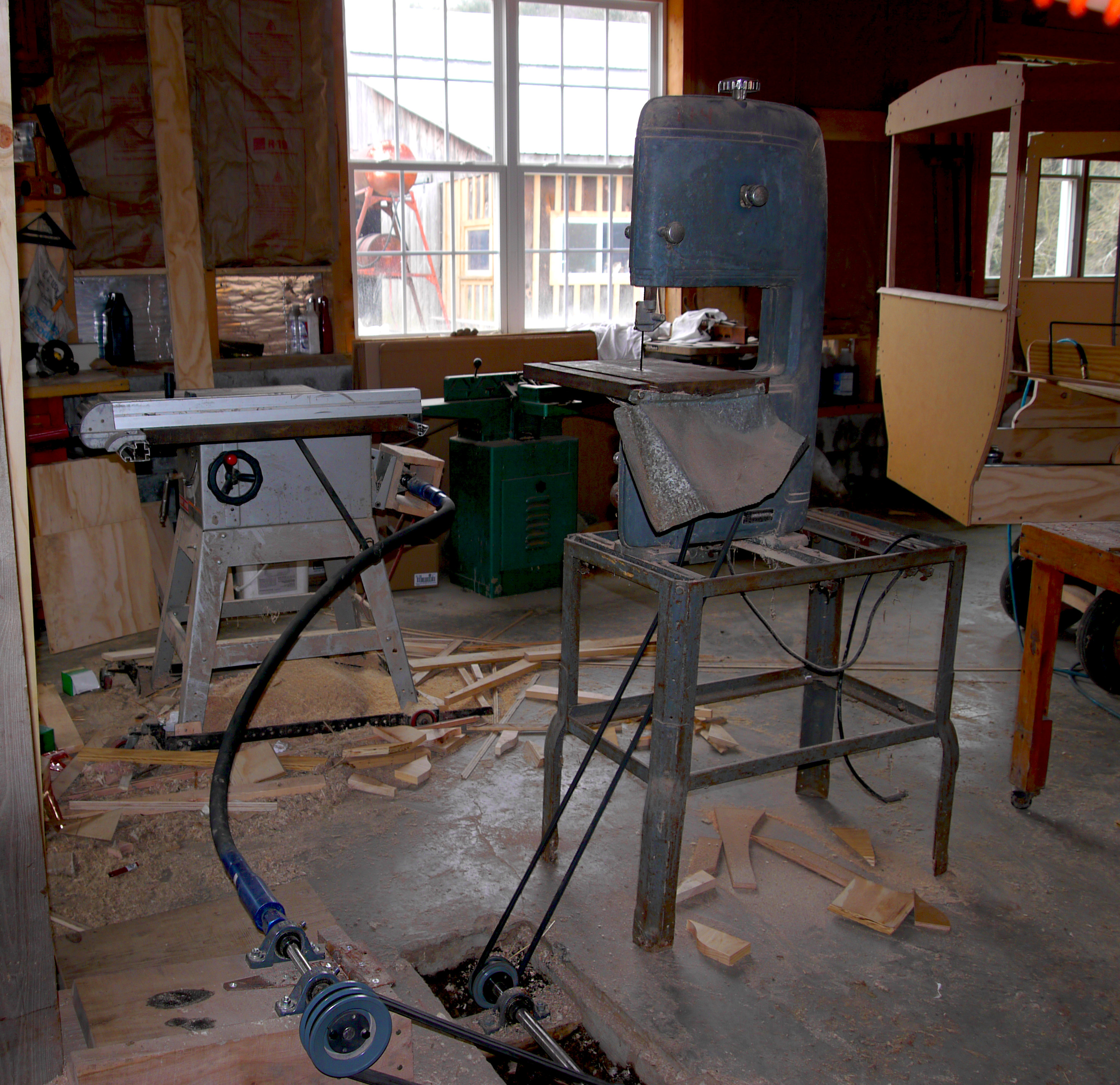 “I have a diesel engine which is hooked to a shaft under the floor that runs the tools. The shaft spins and turns belts on a pulley system attached to the equipment,” he replied pointing to a metal shaft exposed and built into the floor near a bandsaw.