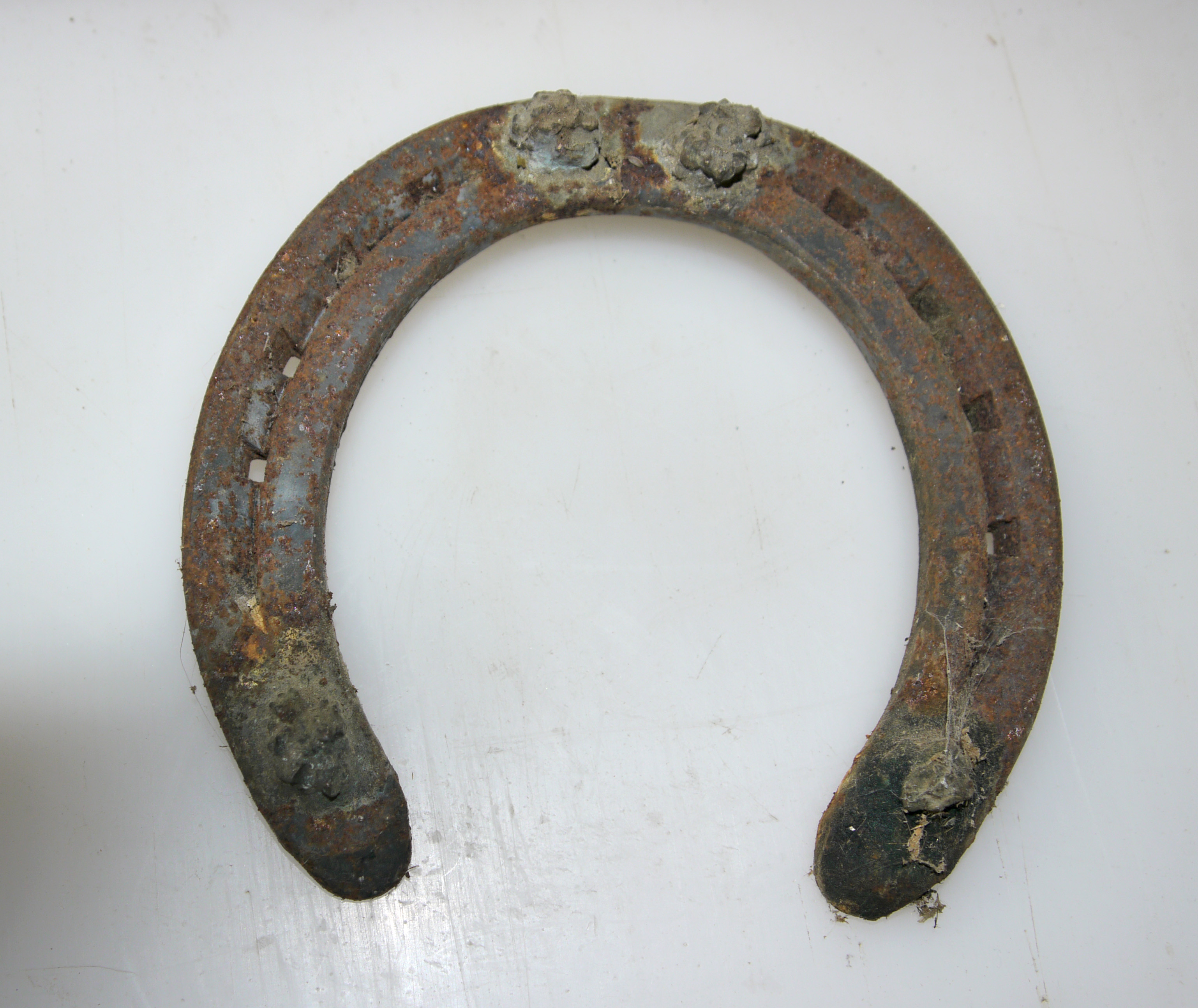 The Amish gentleman picked up a horseshoe from many resting on a shelf and placed it on the table. The shoe had a rough, rounded bit of metal attached to four places on the shoe at the toe and heel.