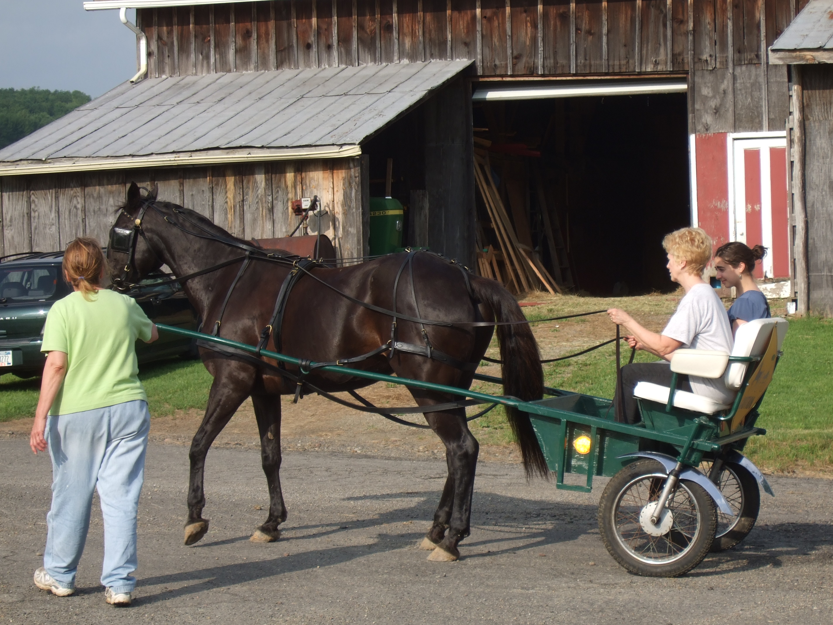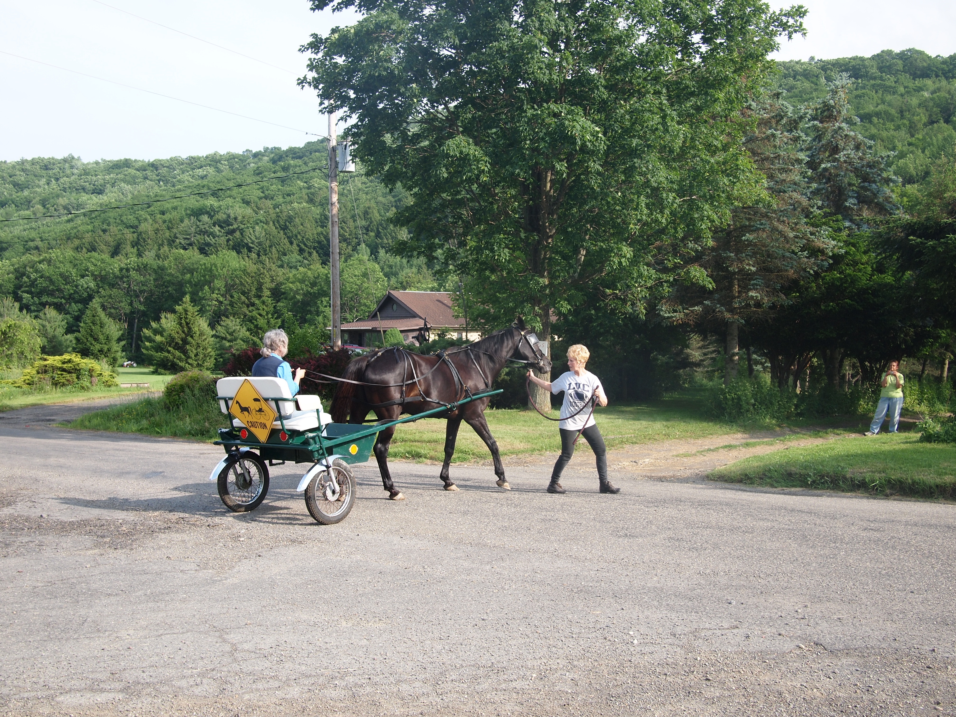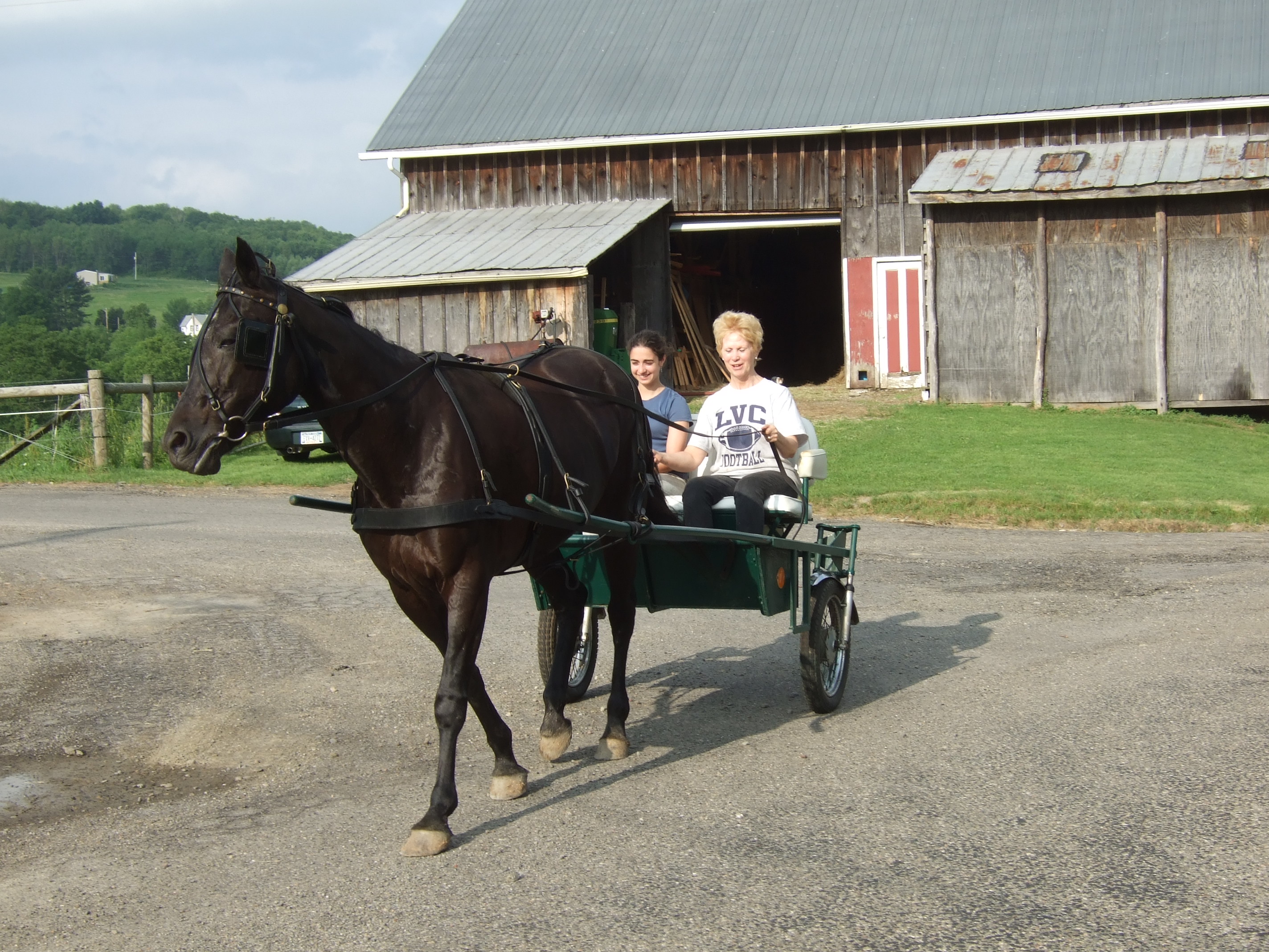 Pepper walked fast and at times broke into a slow trot as the cart bumped along the country road. Donna showed me how to handle the reins and let me drive the cart for awhile. Connie came out to watch and helped turn the cart when Pepper thought she was going back to the barn.