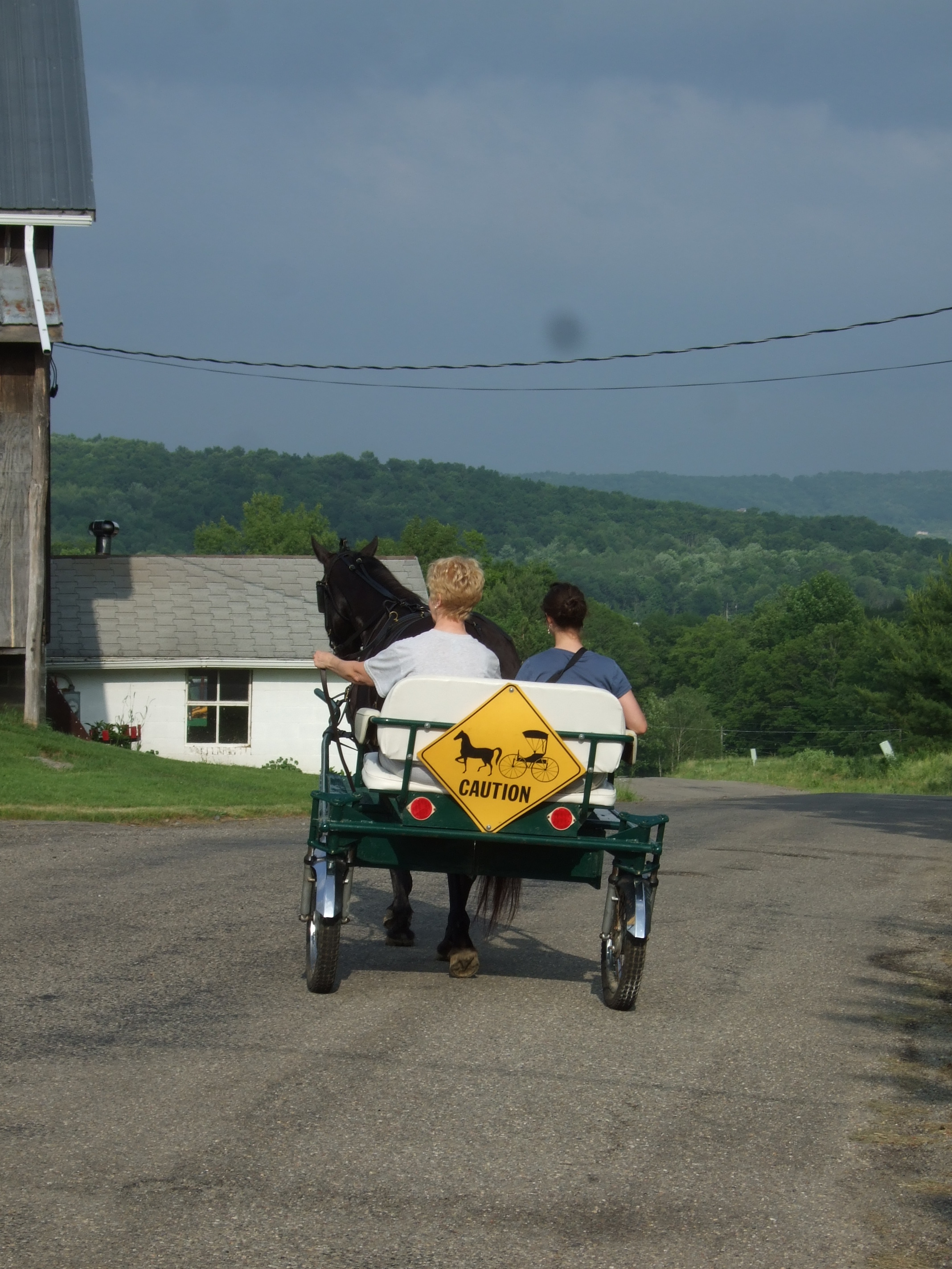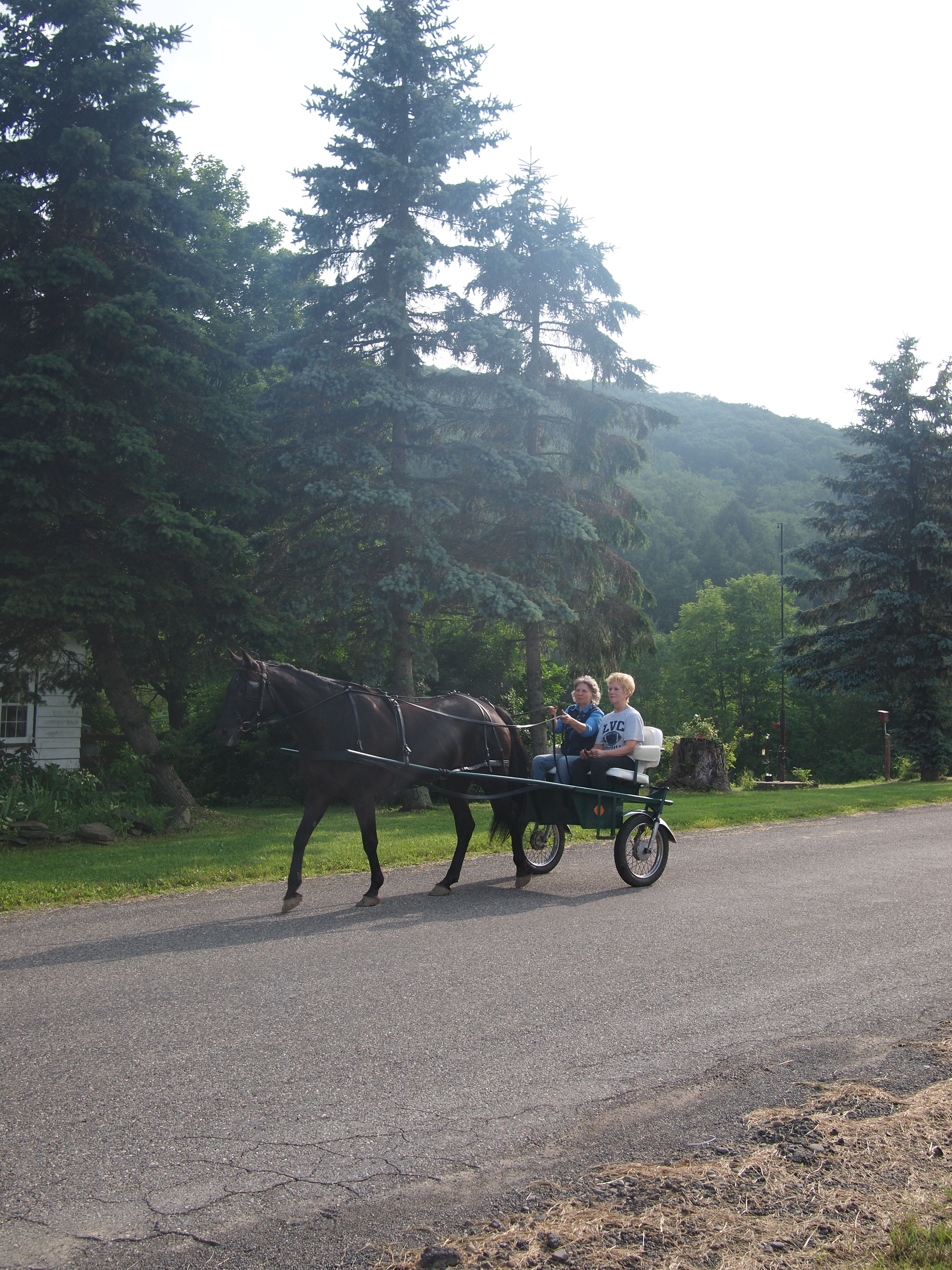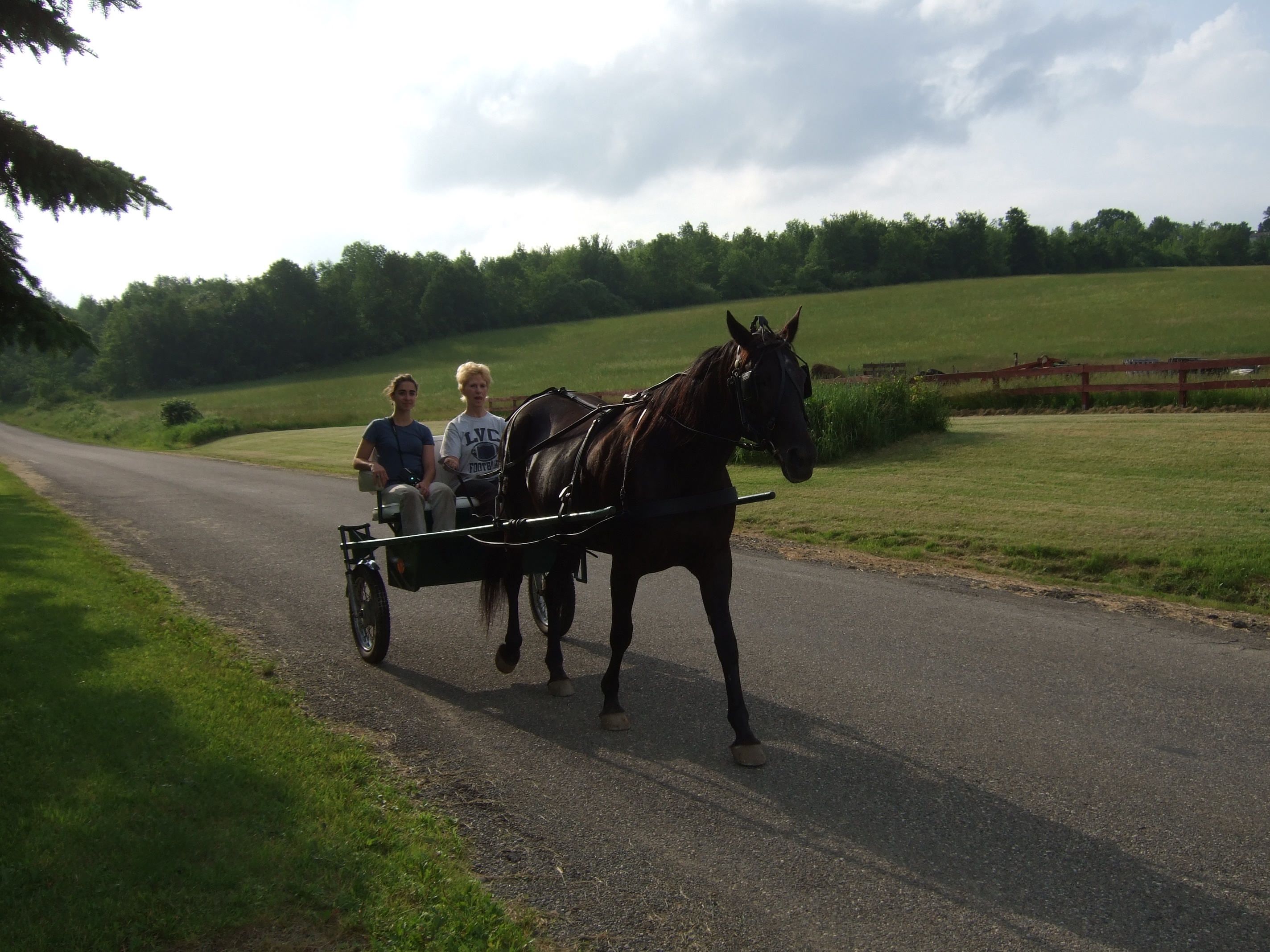 Pepper walked fast and at times broke into a slow trot as the cart bumped along the country road. Donna showed me how to handle the reins and let me drive the cart for awhile. Connie came out to watch and helped turn the cart when Pepper thought she was going back to the barn.