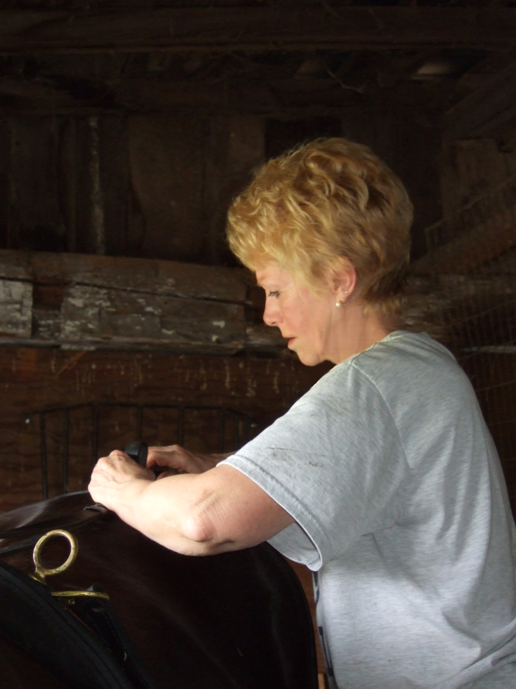“In a minute, I need to get the harness,” she replied. Donna walked to the tack room and came back with the equipment.