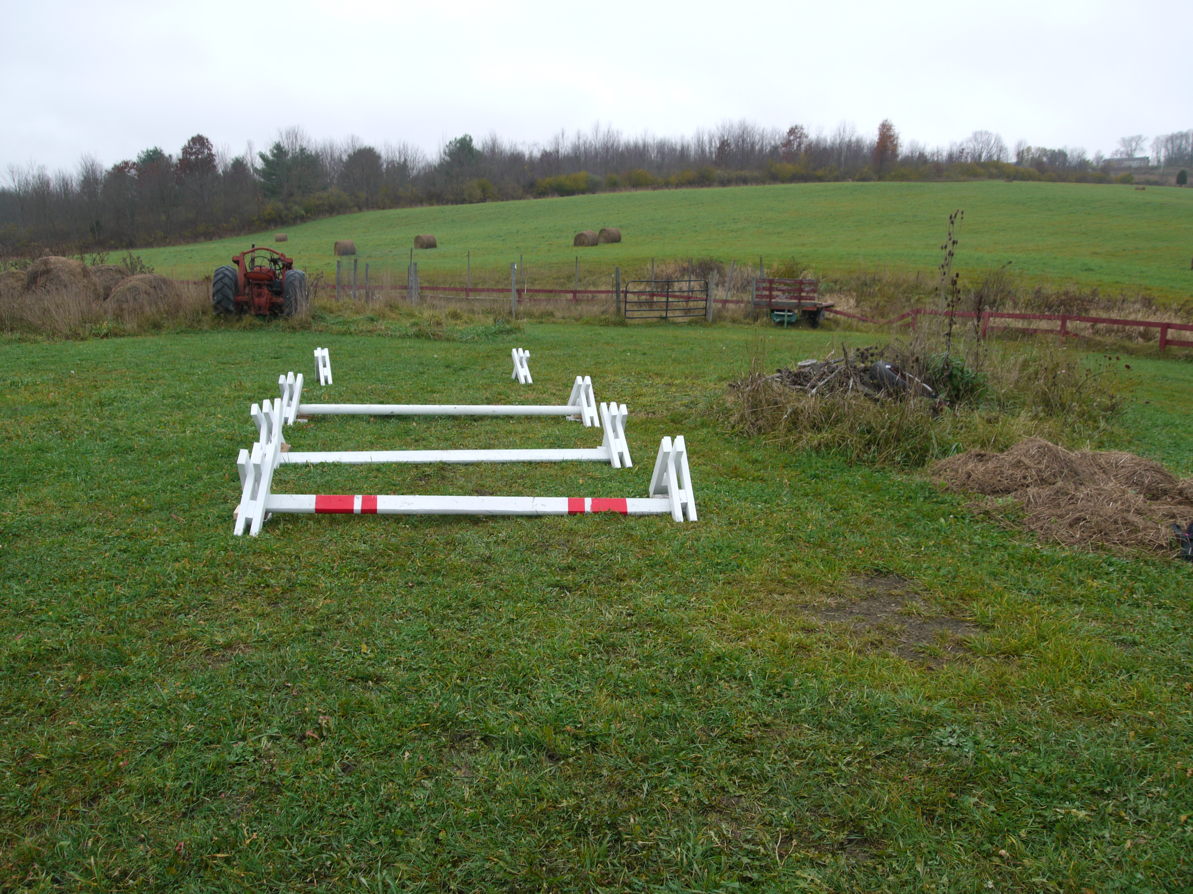 I had never heard of cavalletti; although, I was very familiar with ground poles. After reading a few pages I realized that I needed to change my design for the jump. Instead of making one big jump, I constructed a series of small jumps using 2 X 4s; ending up with a total of seven cavalletti jumps.