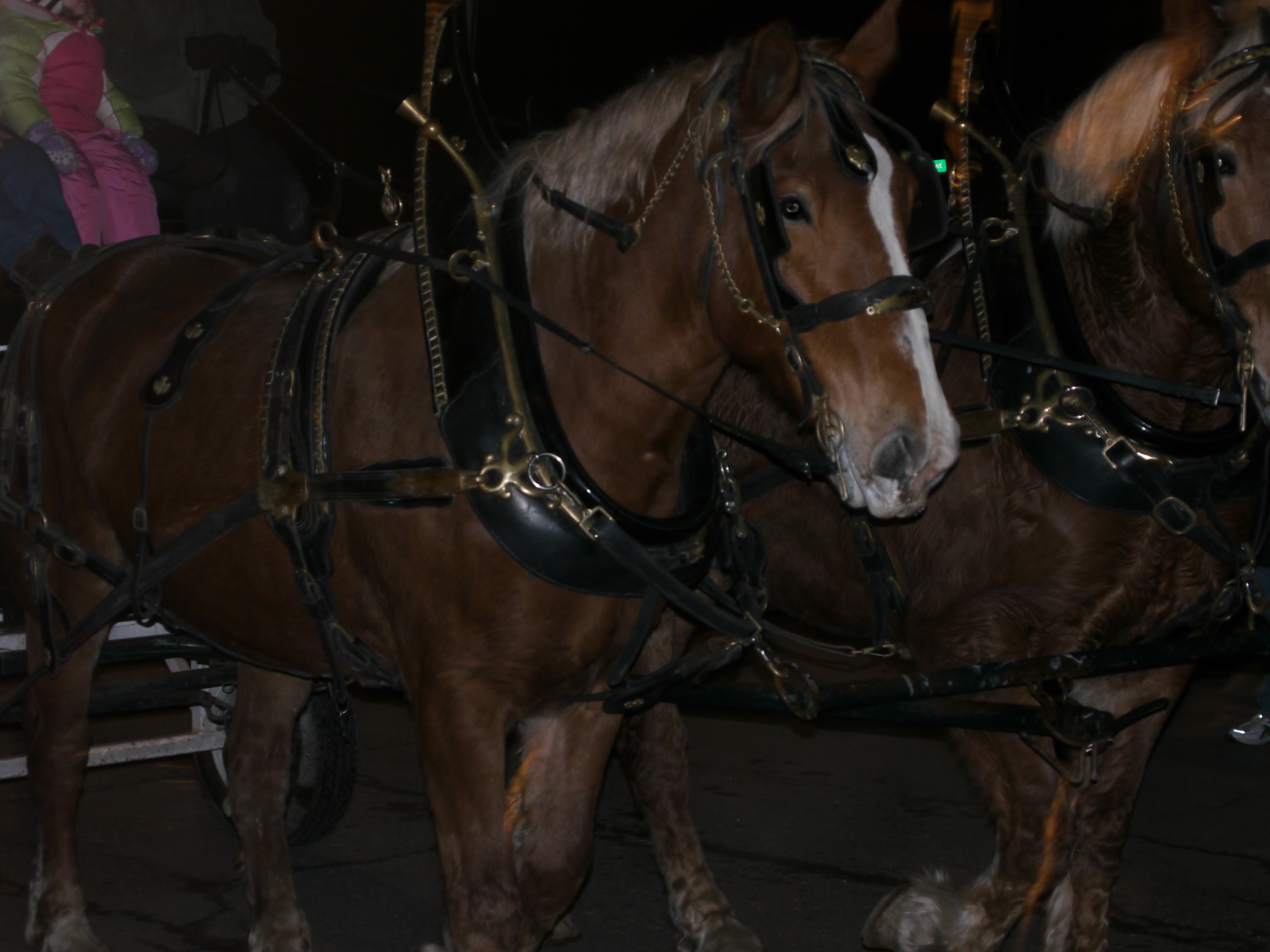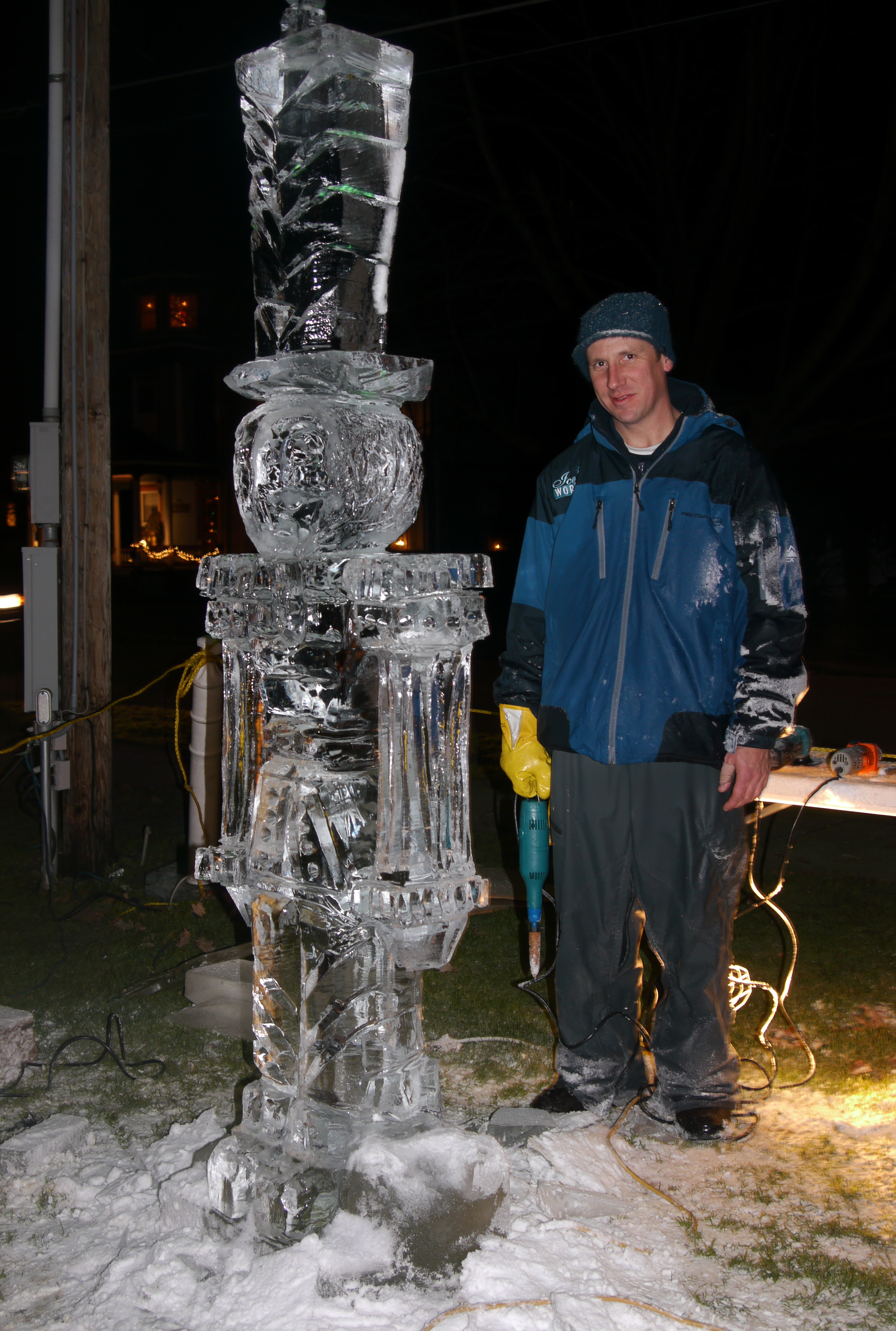 ‘They must have run out of gas’, I thought and hurried down the darkened street. A few families strolled towards me, walking away from the park. A tired team of Belgians and their owner headed for a horse trailer. The sculptors from Sculpted Ice Works finished up their work as a few people watched. I stopped at Mike Swingle’s ‘Christmas Bear’ and bumped into Neil Trimper.