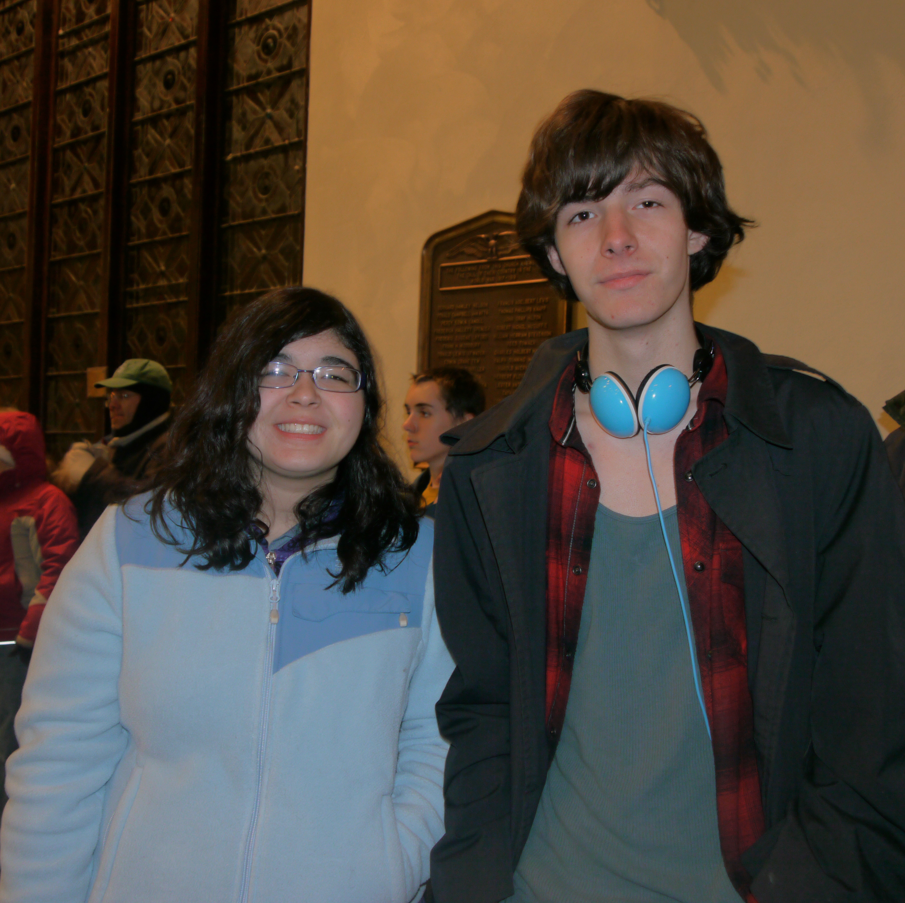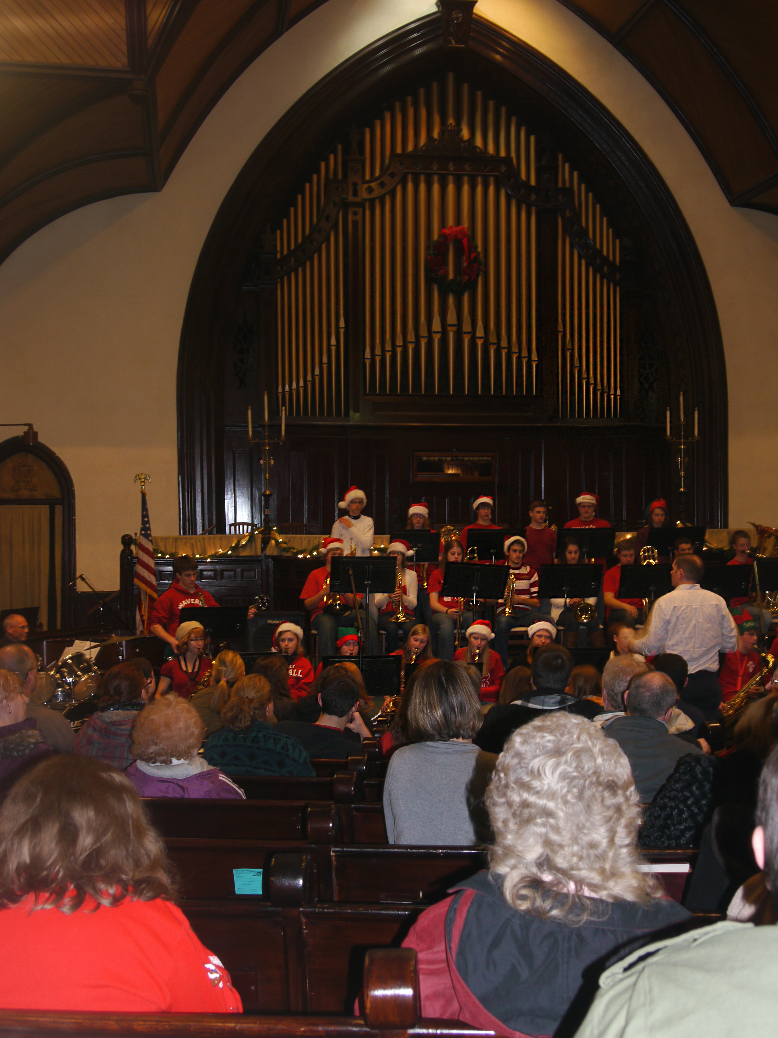 As soon as we entered the church, we met Cristina and her friend Caleb. All of us stood, listened and watched from the back row near the door; most of the seats were already taken. In front of the towering pipe organ, the members of the Waverly High School Jazz Band played swing music from the 1940’s. Jazzy Christmas music filled the old church. The bright, brassy sound produced by trumpet players mingled with the raspy saxophones and soft woody whispers from the clarinets. The drums supplied the rhythm and the conductor‘s baton delivered the tempo. The air filled with familiar holiday melodies which were enjoyed by old and young alike.