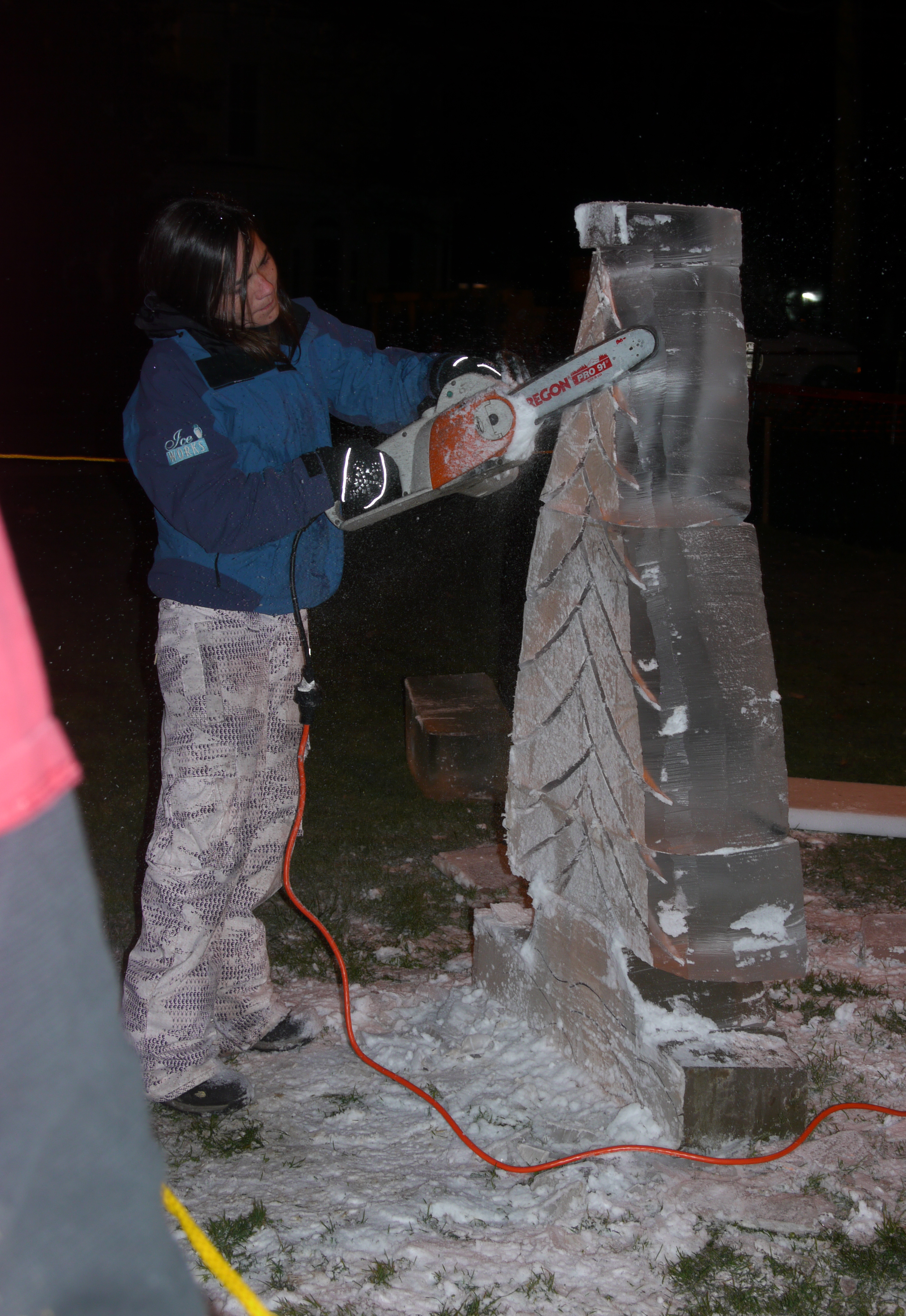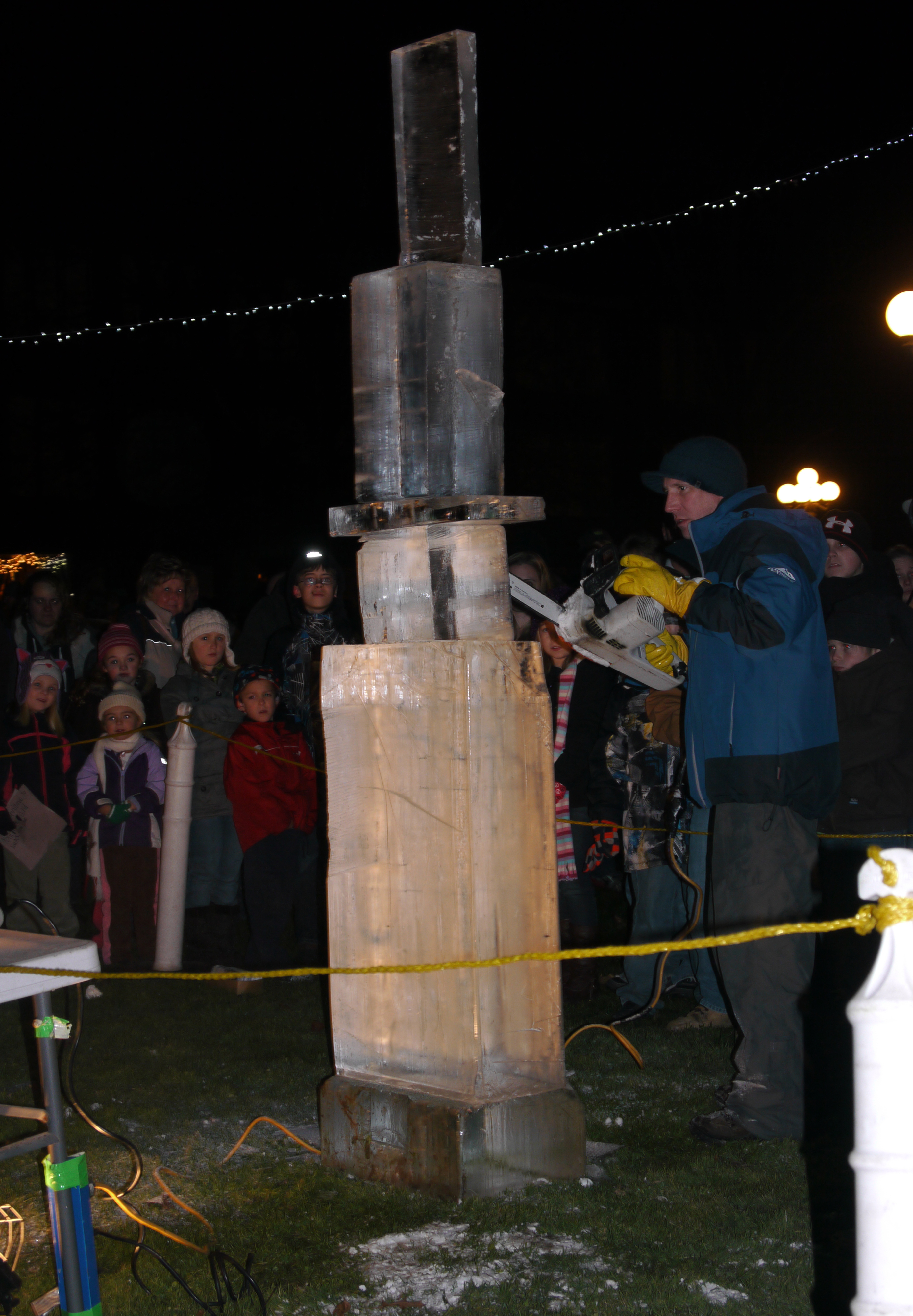 We walked in a huge circle around the park, pausing at the chain link fence which held Mike Cary’s reindeer. I looked for James Steffen, the young man I met last year, but didn’t see him in the enclosure. A little further on, we saw Santa in his sleigh inside a small pavilion. He handed out red and white striped candy canes and listened to children’s Christmas gift requests. We continued walking and briefly stopped to watch the ice sculptors begin their creations.