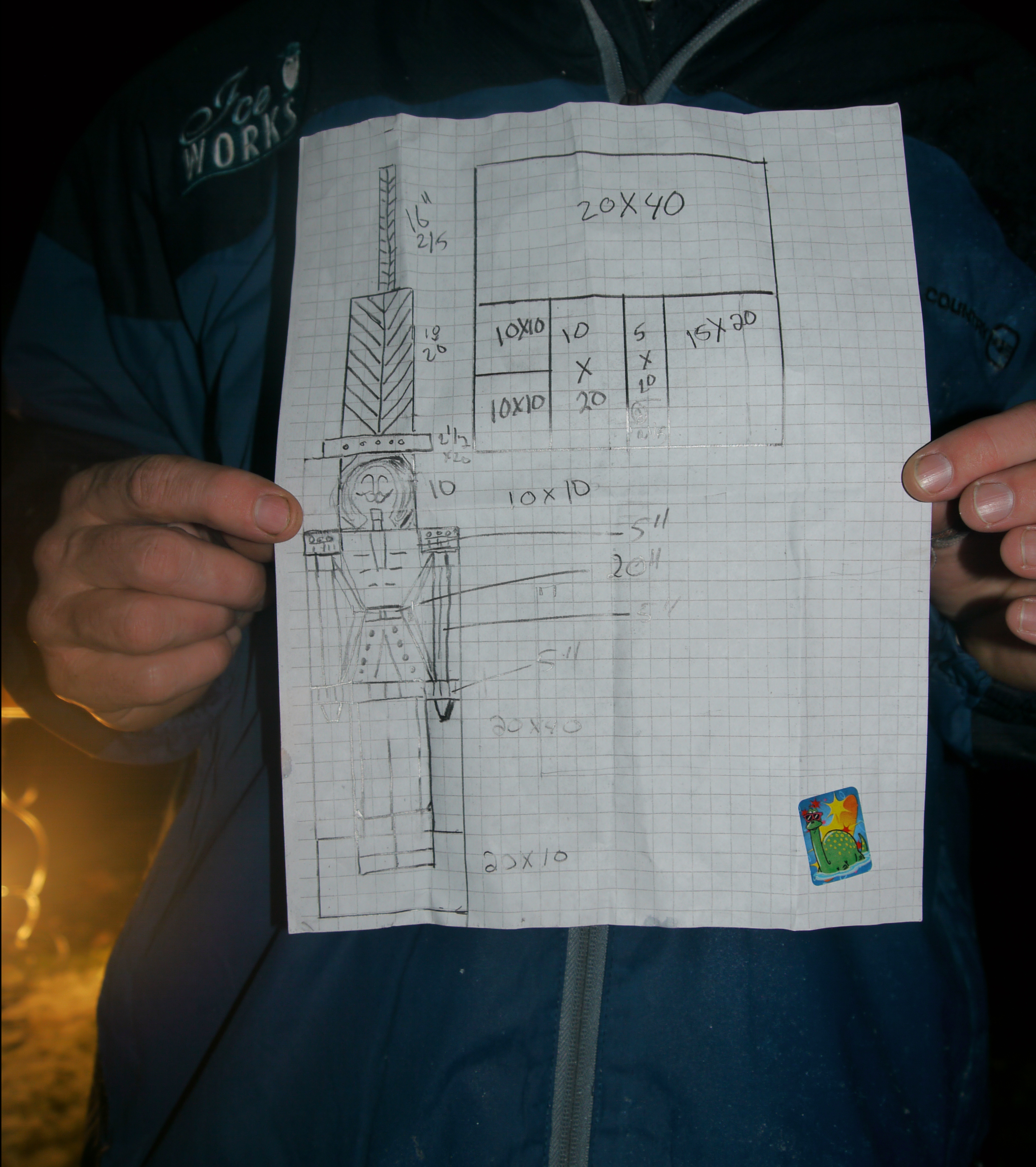 “Yes, we draw a sketch and work out how many blocks of ice we’ll need for the sculpture,” he replied pulling a piece of paper from his pocket. John unfolded the sketch and showed me the blueprint for his work of art. “It’s important to know how the blocks of ice will fit together before we start carving. My design is a combination of 3 different objects; one nutcracker and two toy soldiers. I began with two 20 X 40 blocks of ice, frozen at 16 degrees.”