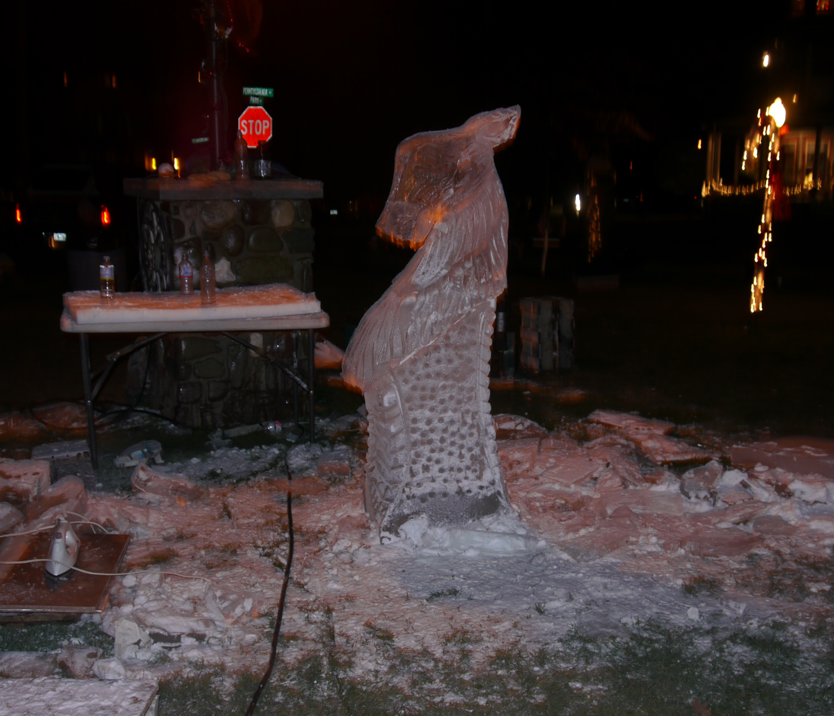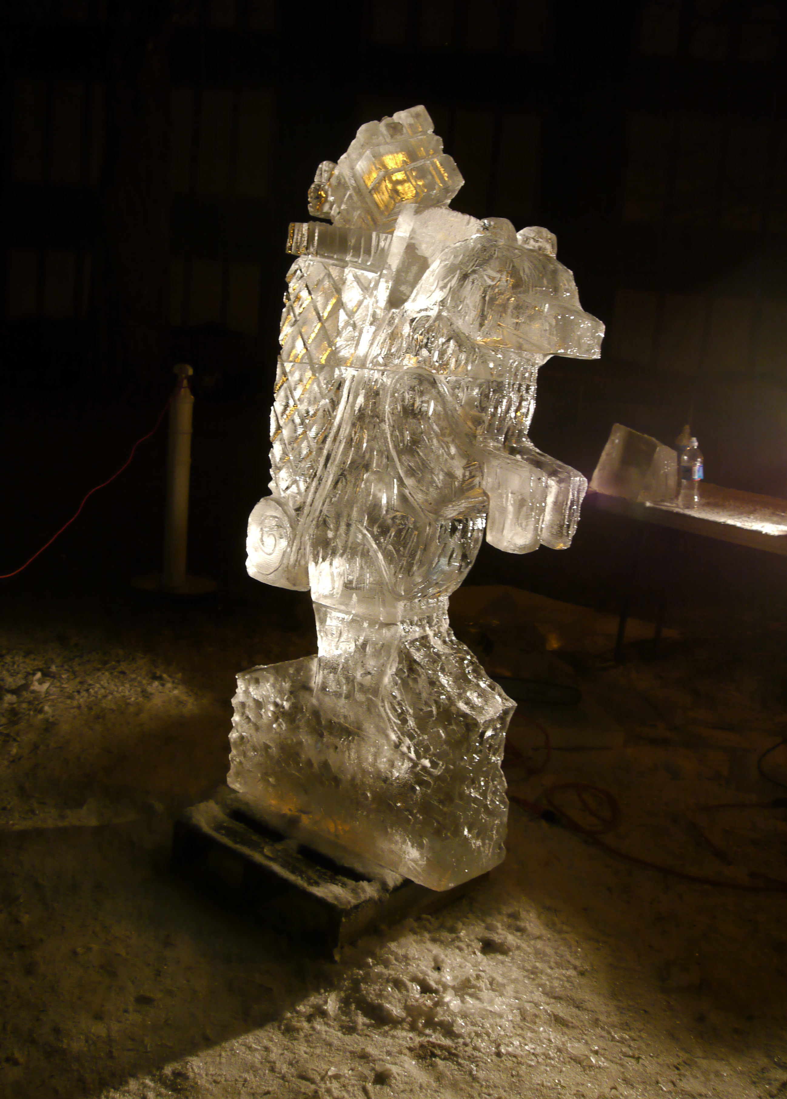 I headed back across the deserted park. Mike Cary loaded his sleigh onto the back of his truck and the reindeer waited to return home. The street lights made the ice sculptures shine in the dark as light reflected off their shiny surface. I stopped for a moment in front of Neil’s sculpture. Even without the antlers it was a nice piece of artwork. I thought, ‘sometimes we have to push the limits even if we fail, for with every failure comes knowledge of how to succeed next time.’