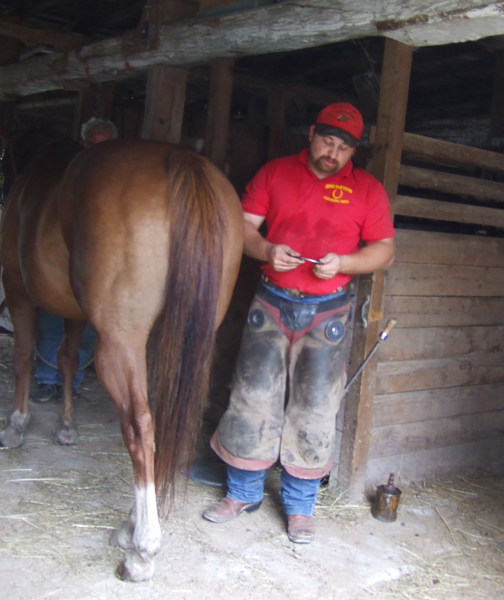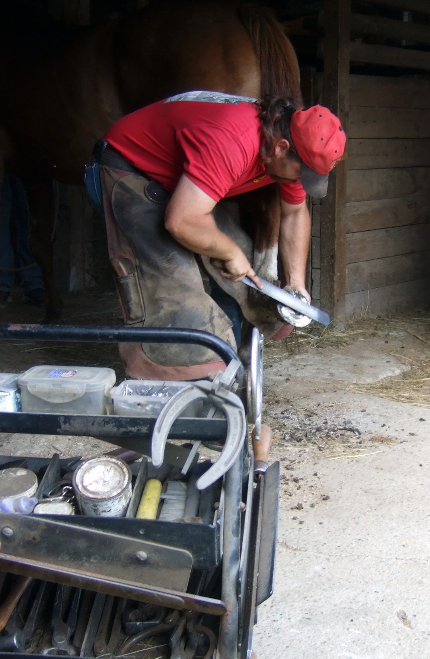 Gene’s truck was parked in front of the barn and the tailgate doors were open exposing a huge anvil, a wide assortment of tools, and lead ropes. I walked into the barn and found Johnn holding Pepper as Gene trimmed her hoof. I explained the problem with the boots and asked if he would measure Pepper’s front feet. He measured her feet, wrote down the numbers on a piece of paper and handed it to me.